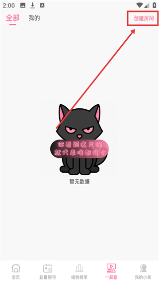 2、进入一起看页面后,点击右上角【创建房间】,可进入房间创建设置页面哦。