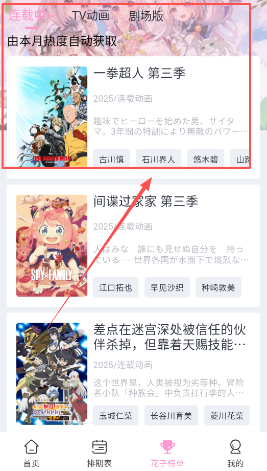 3、在花子榜单里能看到本月热度自动生成的排名,比如一拳超人第三季和间谍过家家第三季,帮助你快速了解热门作品。