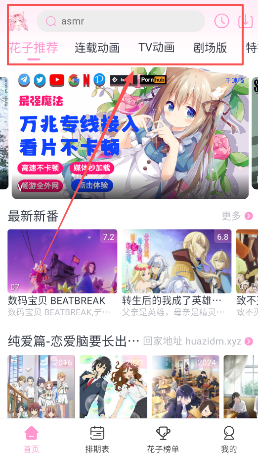 1、首先打开软件,在首页就能看到花子推荐和最新新番,想看什么直接点进去就行,找片很方便呢。