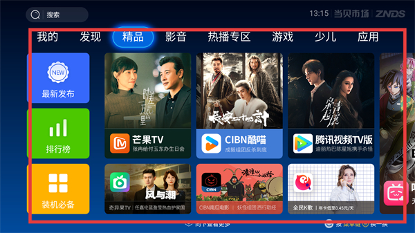 1、在首页【精品】频道能看到各类应用推荐,像【芒果TV】【CIBN酷喵】等,点击目标应用就能进入详情页啦。