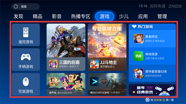 3、切换到【游戏】频道能看到【遥控游戏】【手柄游戏】等分类,还有【三国的后裔】等游戏推荐哦。