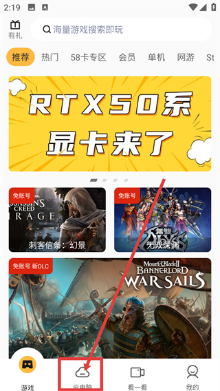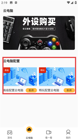 1、在游戏页面点底部的【云电脑】按钮,就能切换到云电脑界面,准备选择配置啦。