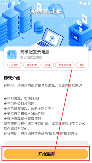 3、进入高级配置云电脑详情页后,点底部的【开始连接】按钮,就能触发计费方式的选择弹窗啦。