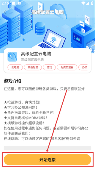 4、进入高级配置云电脑详情页,点击底部【开始连接】按钮,就能连接该云电脑来运行游戏咯。