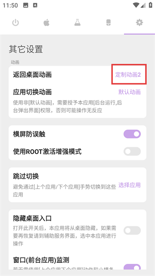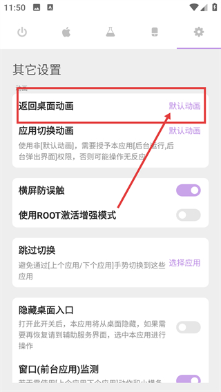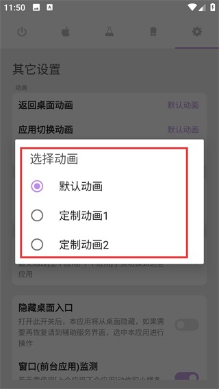 2、进入其它设置页后点【返回桌面动画】选项,能打开动画选择弹窗,可更换返回桌面的动画样式哦。