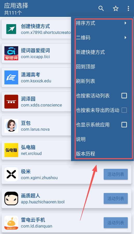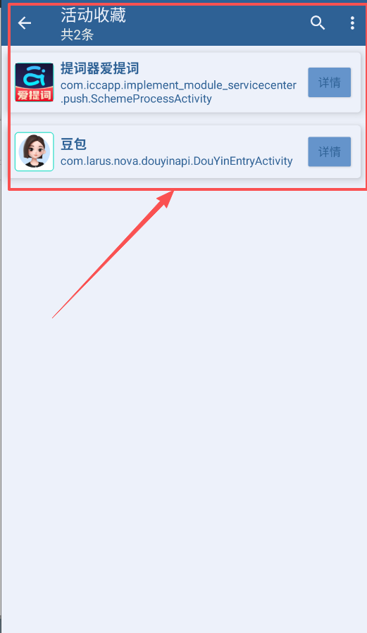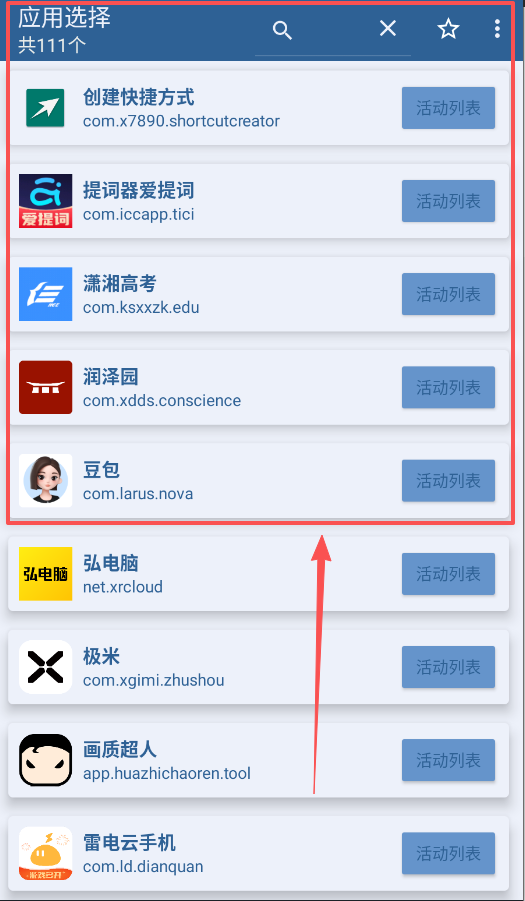 二、在活动列表中挑选功能。每个应用下会显示多个可直达的活动页面,例如豆包的DouYinEntryActivity。