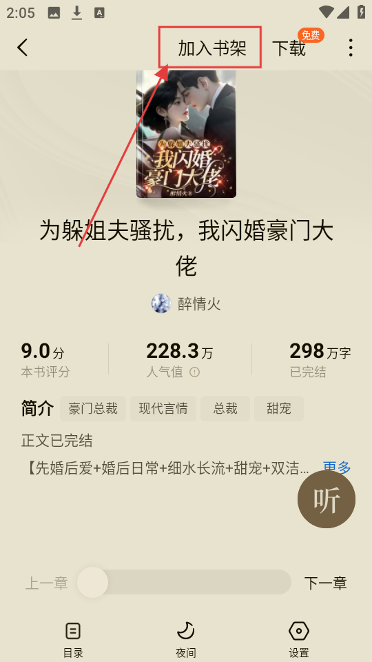 2、在作品《为躲姐夫骚扰,我闪婚豪门大佬》详情页,点击【加入书架】,可将其存至书架。