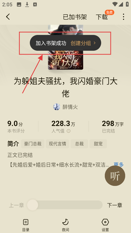 3、添加作品到书架后,会提示“加入书架成功”,还能创建分组,方便整理书架内容。