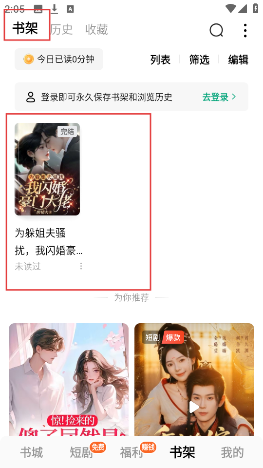 4、在书架页,能看到已添加的《为躲姐夫骚扰,我闪婚豪门大佬》,方便后续找到阅读。