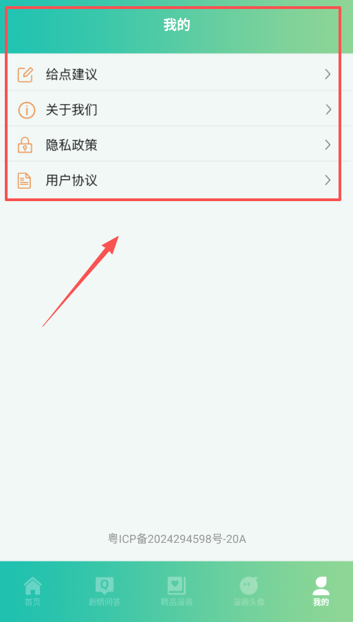 4、我的页面是个人中心,可以给软件提建议、查看关于我们和协议条款。