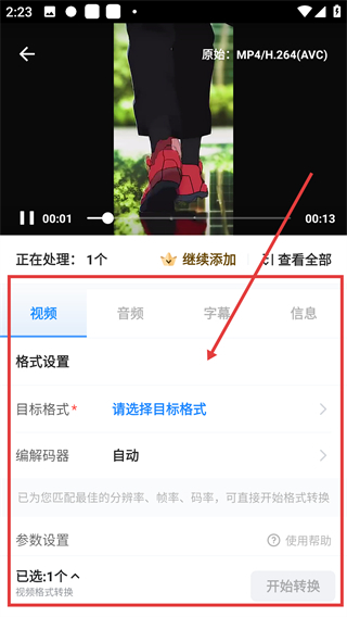 2、进入视频格式转换页后,选好视频,点【请选择目标格式】可挑选要转换的格式,设置后就能准备转换哦。