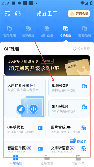 3、切换到GIF处理页,点【人声伴奏分离】选项能进入音频分离功能页,后续可提取音频里的人声或伴奏啦。