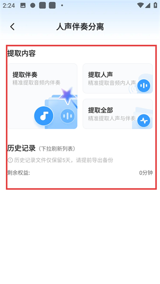 4、进入人声伴奏分离页后,可选【提取人声】等选项,操作后能精准分离音频内容,不过要注意权益剩余时长哦。