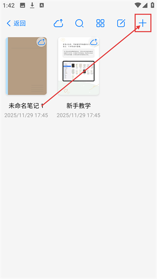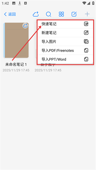 2、进入未归档笔记页面后,点击右上角的【+】按钮,会弹出操作菜单,可选择创建新内容的方式哦。