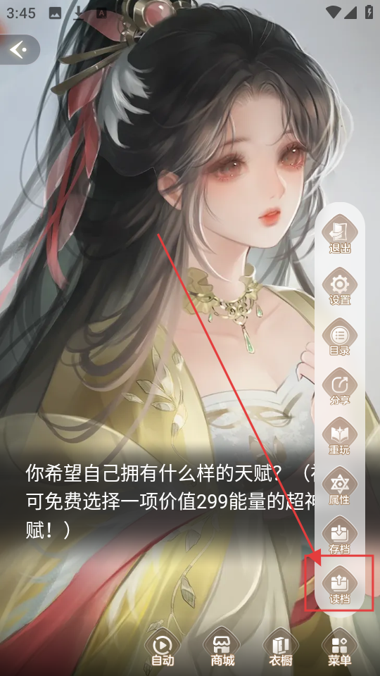 2、展开菜单后,点击【读档】,就能进入读档页面,选择之前的存档继续游戏。