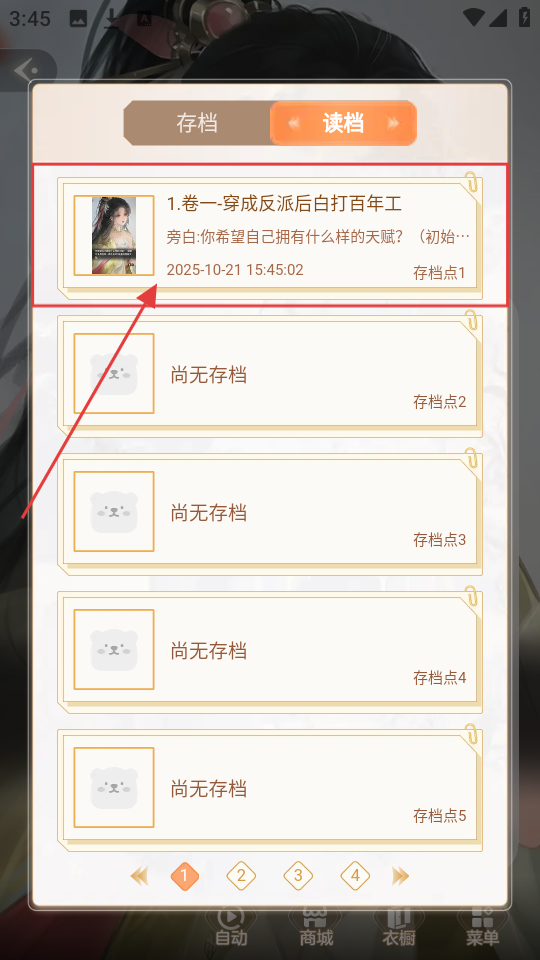 3、在读档页面,选要读取的存档,比如【卷一-穿成反派后白打百年工】,点击它。