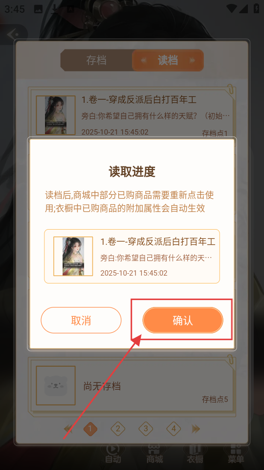 4、弹出读取进度确认框,点击【确认】,就能读取该存档,继续之前的游戏进度啦。