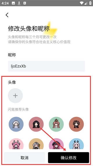 3、在修改头像和昵称页,选闪氪推荐的头像,确认信息后点【确认修改】就能更新头像啦。