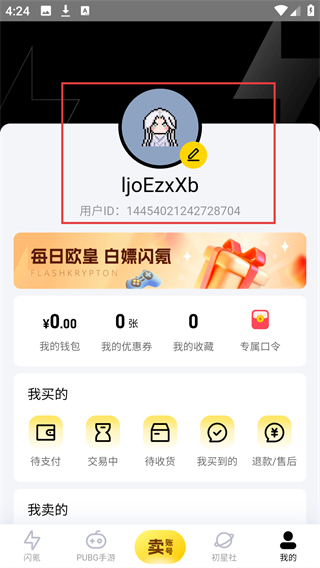 1、在闪氪首页点底部【我的】按钮能进入个人中心,后续可管理账号信息或查看交易状态啦。