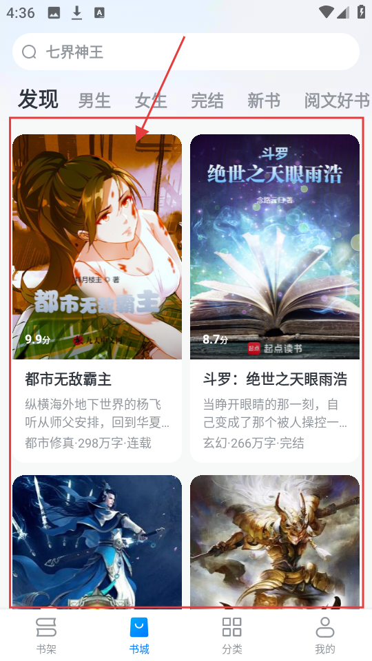 1、在书城发现页面,有很多小说推荐,比如【都市无敌霸主】等,可挑选感兴趣的小说点击进入详情页。