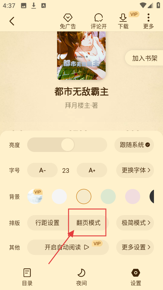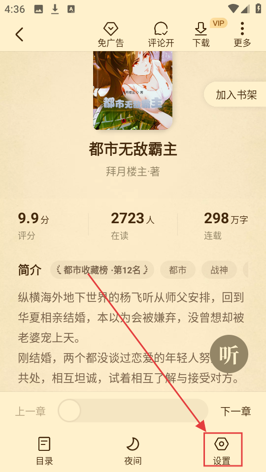 2、进入小说详情页后,若想调整阅读设置,点击页面底部的【设置】按钮,就能打开设置选项啦。