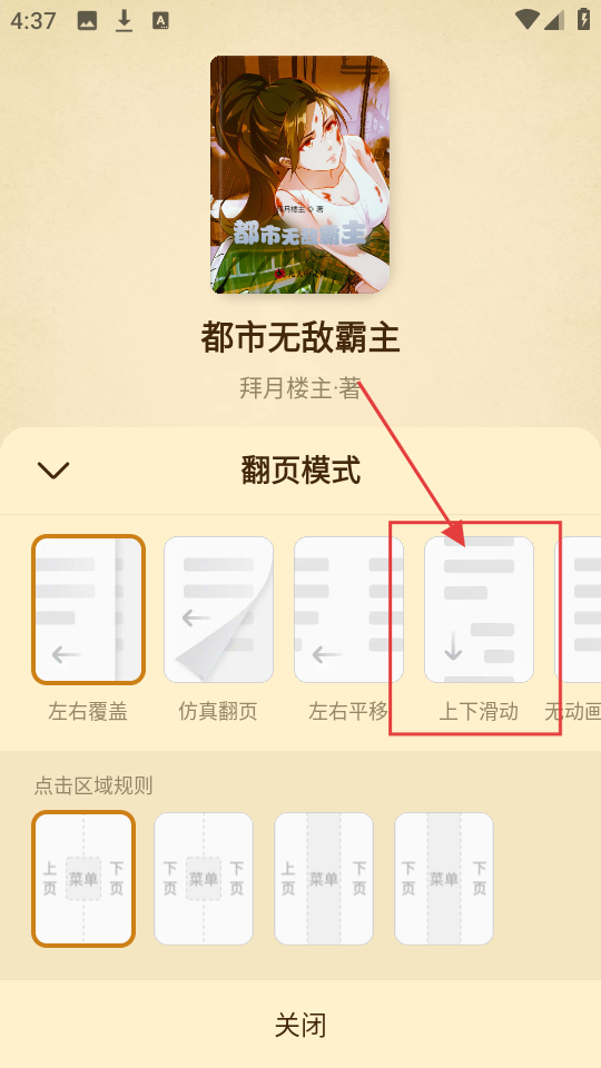4、进入翻页模式选择页面,有左右覆盖、仿真翻页等多种模式,若想选【上下滑动】模式,点击它即可设置成功。