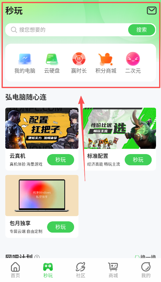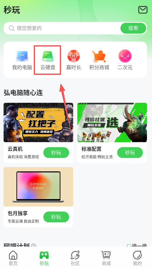 1、使用软件很简单,主界面清晰地列出了各种游戏和云电脑配置,你只需要浏览并点击感兴趣的条目下的“秒玩”按钮即可。