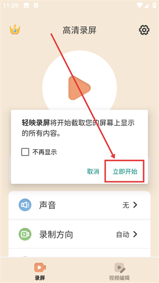1、在高清录屏页点【开始录制】按钮,就能触发录屏的确认提示,准备开启屏幕录制啦。