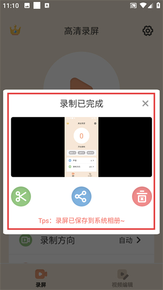 4、录制完成后会弹出提示,录屏文件会保存到系统相册,还能直接选剪辑或分享功能哦。