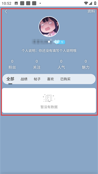 4、进入个人资料界面,可查看账号等级、个人说明等信息,还能切换标签查看对应内容哦。