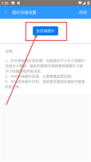 2、进入图片压缩设置页后点【去压缩图片】按钮,能进入图片选择界面,可挑选要压缩的图片哦。