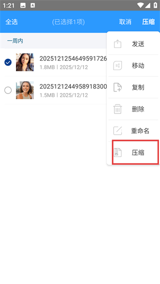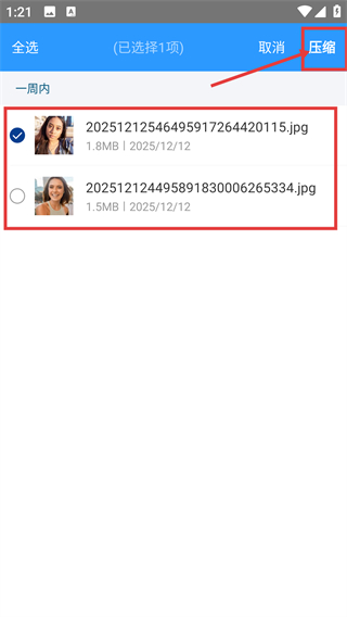 3、在图片选择界面选好目标图片后,点右上角的【压缩】按钮,就能启动图片的压缩流程啦。