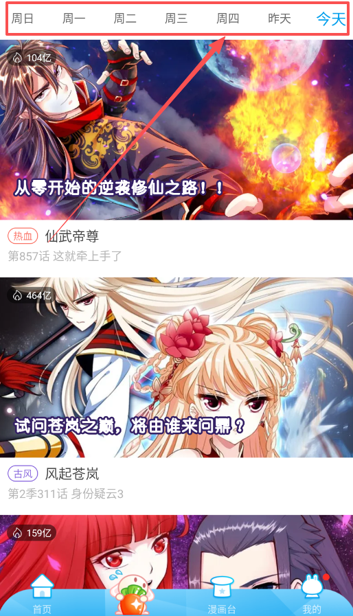 3、接着呢,关注漫画更新很简单,在更新页面能看到一周的更新日历,标注了每天更新的漫画,方便你追更感兴趣的作品。