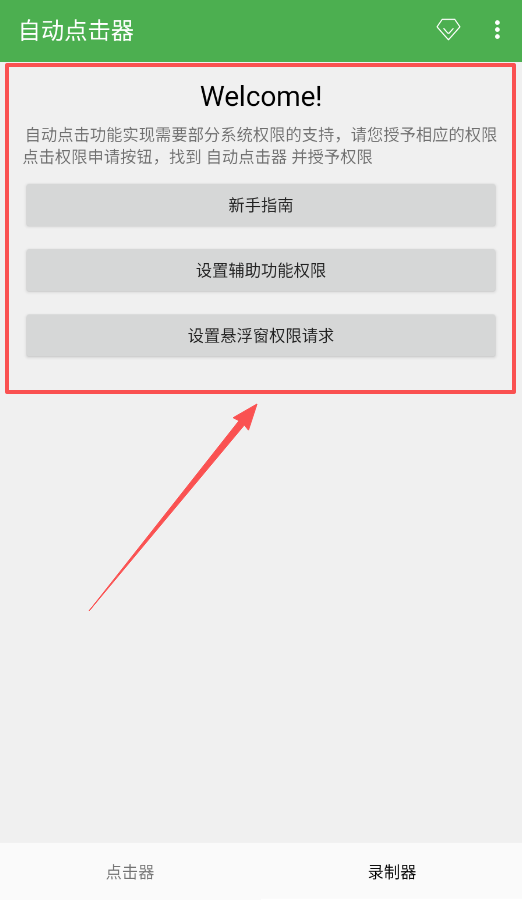 1、启动自动点击器后,第一步就是跟着新手指南完成授权,先设置好辅助功能权限,再搞定悬浮窗权限,可不要忘记了呢。