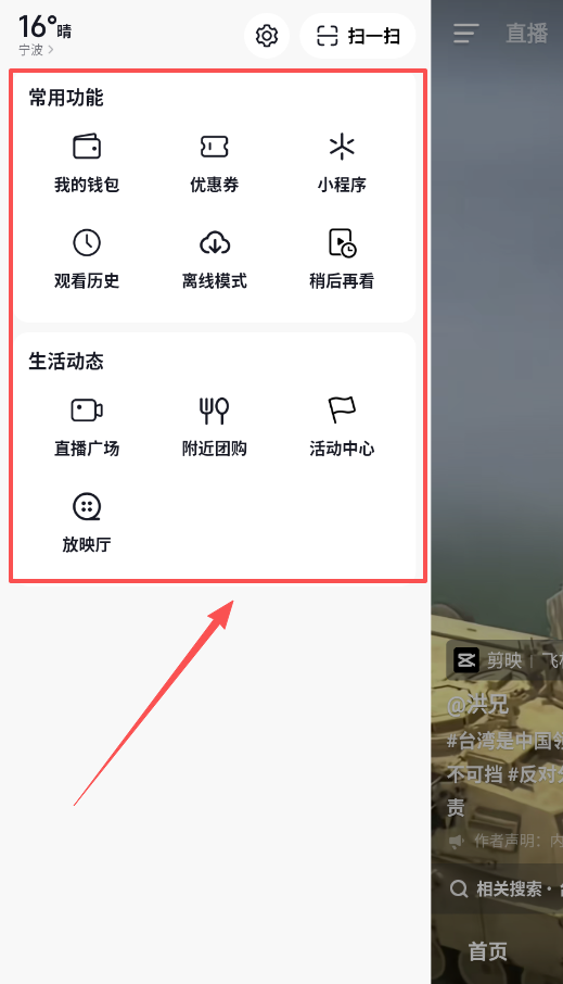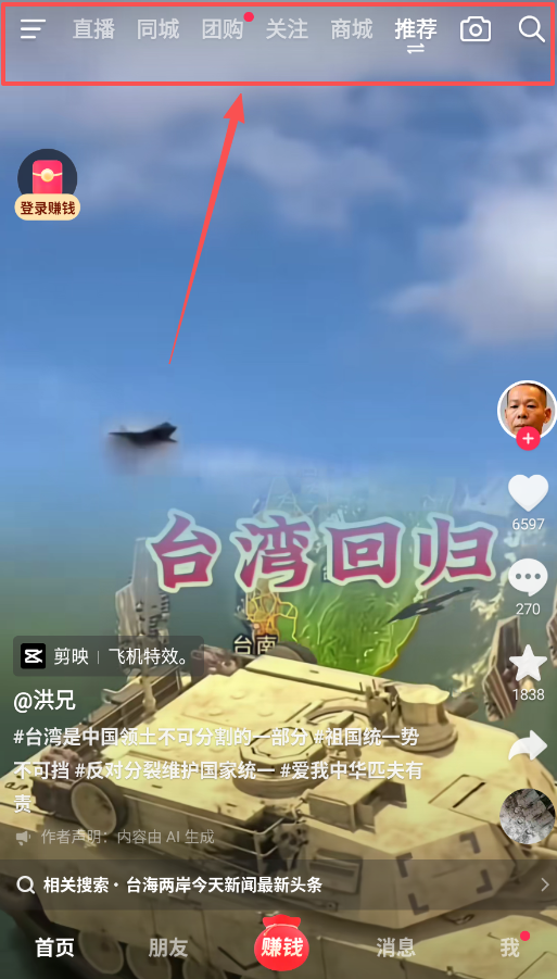 2、想要浏览热门内容,可以关注首页的推荐板块,那里有直播、同城、团购等分类,你还能看到台湾回归等正能量话题。