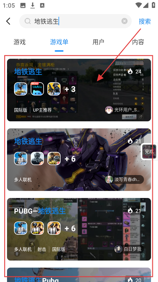 2、搜索结果里切换到【游戏单】标签,能看到多个“地铁逃生”相关游戏单,选中心仪的查看详情咯。