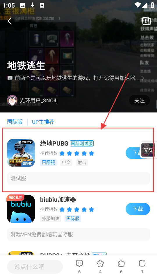 3、进入游戏单详情,看到推荐的《绝地PUBG》国际测试版,点击可进入该游戏详情页面,了解更多信息。