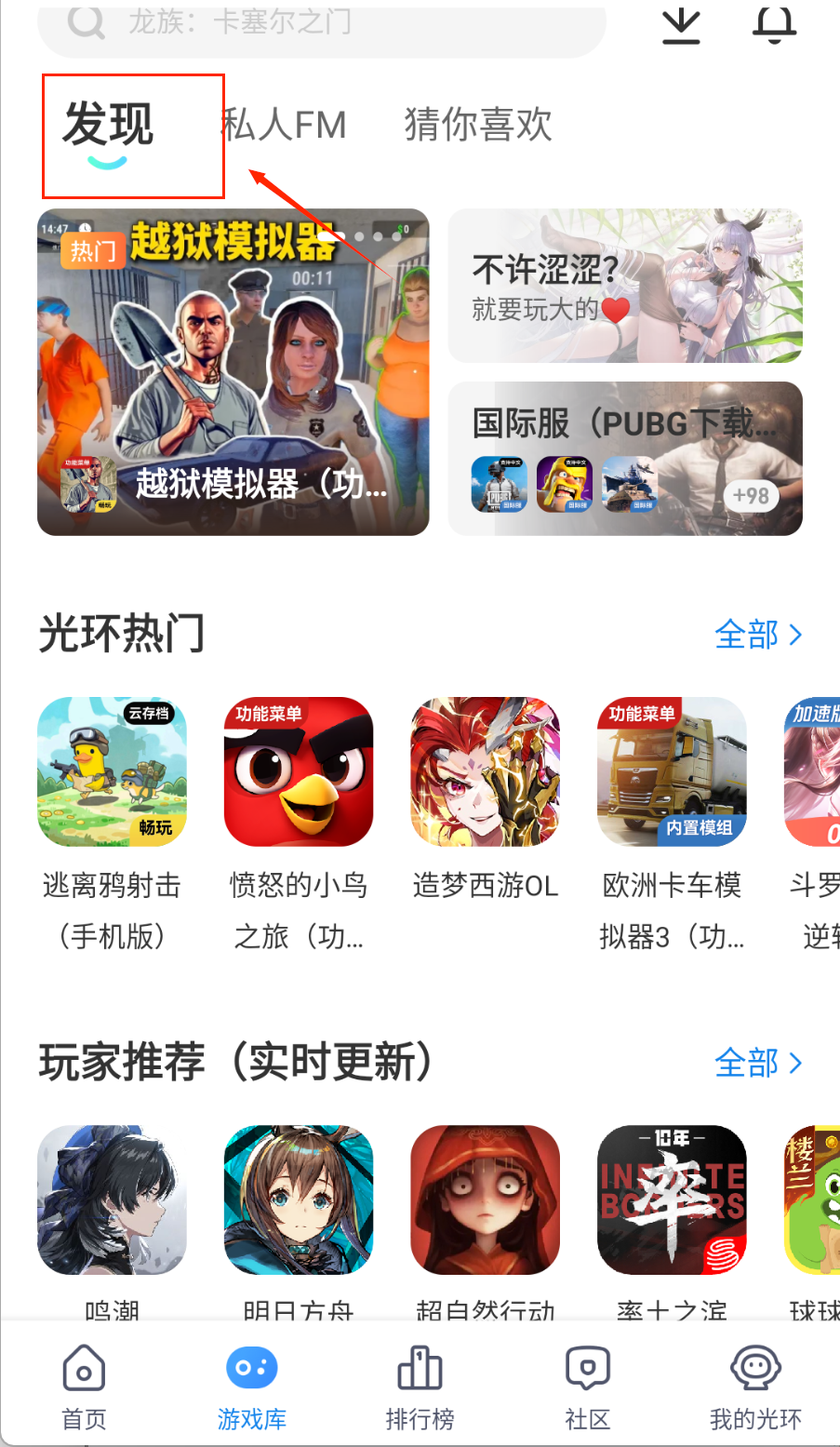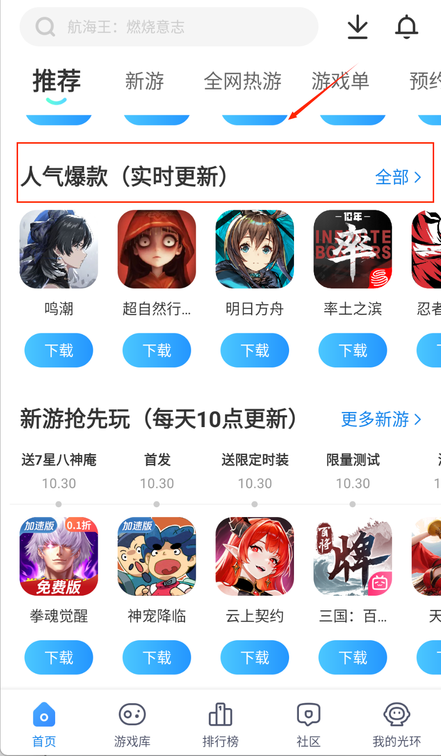 2、浏览推荐板块的"人气爆款"和"新游抢先玩"栏目,这里会实时更新热门游戏和新作信息,比如每日10点更新的新游板块很有参考价值。
