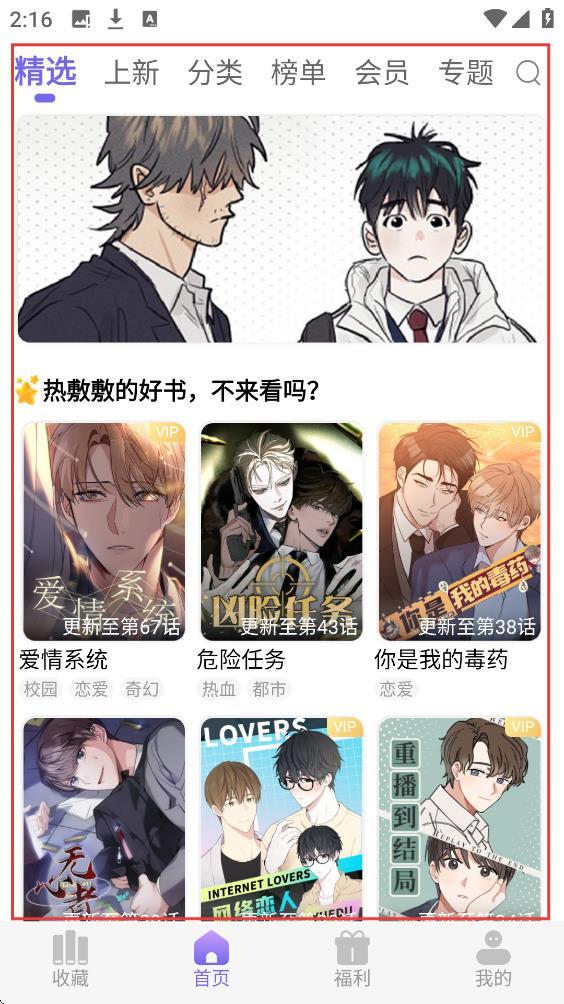3、退出后,可看到APP首页的精选漫画内容,方便浏览各类漫画啦。