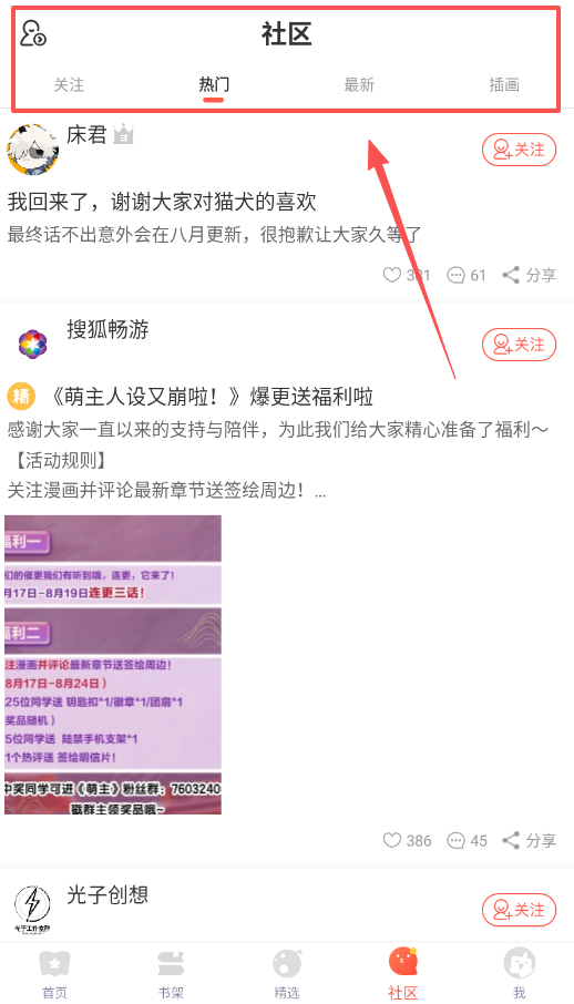 2、想要和作者互动或参加活动,可以切换到社区页面。在这里能看到作者发布的更新通知,注意看好活动时间哦。