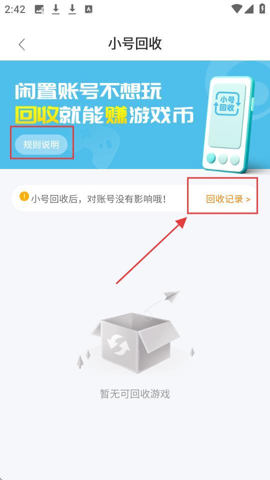 3、在小号回收界面,点击【回收记录】按钮,进入回收记录页面,可查看相关回收情况啦。
