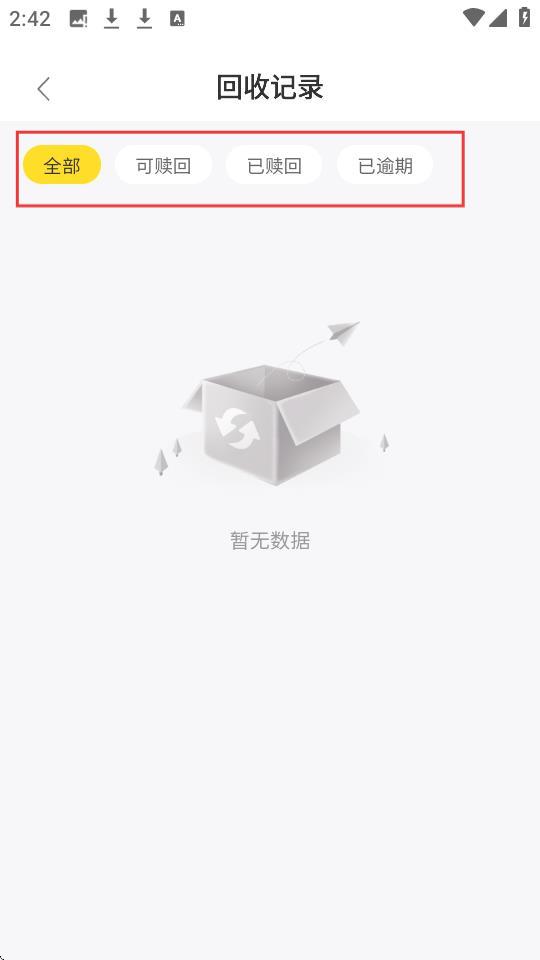 4、在回收记录页面,可根据【全部】【可赎回】【已赎回】【已逾期】等分类,查看不同状态的回收记录,方便管理哦。