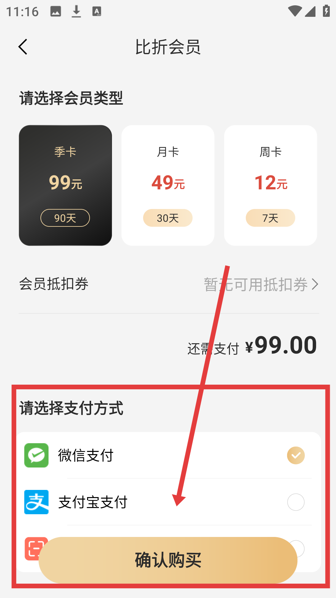 4、选择会员类型和支付方式后,点【确认购买】,即可完成会员购买哦。