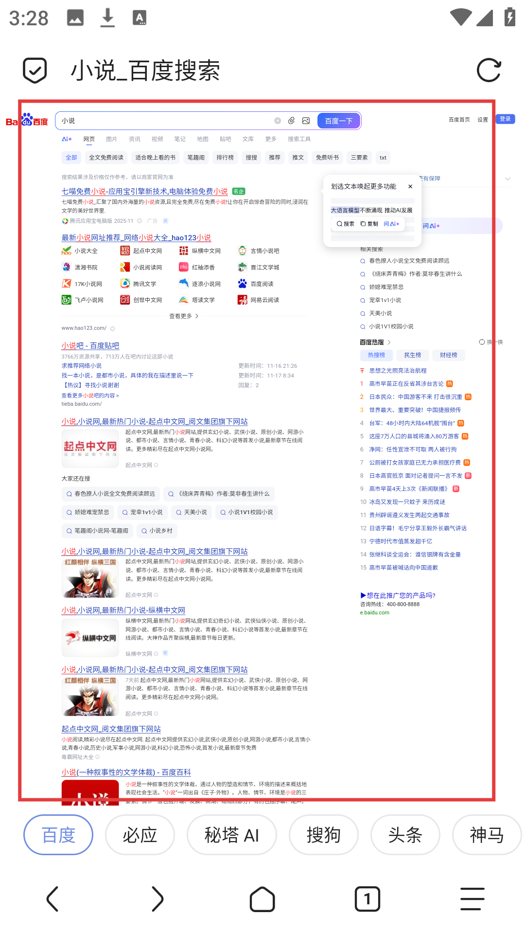 4、模式切换完成后,就能以电脑端布局浏览内容,比如搜索【小说】相关结果啦。