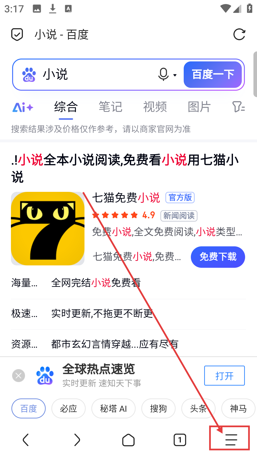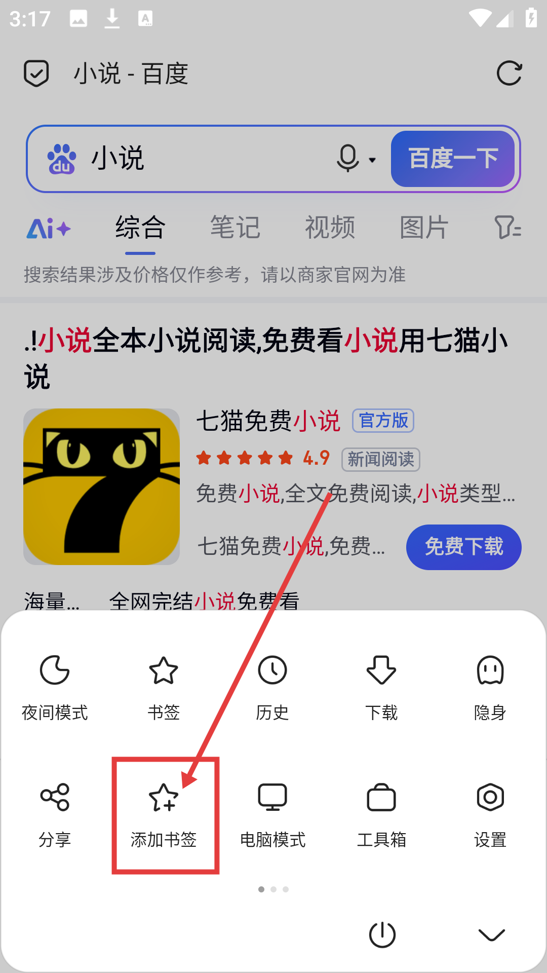 1、在百度搜索“小说”的结果页面,点击右下角菜单按钮,可展开功能选项栏,准备添加当前页面为书签啦。