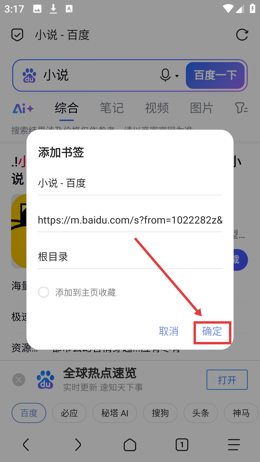3、在添加书签窗口中,确认页面信息后点击【确定】,即可将当前“小说-百度”页面添加为书签啦。