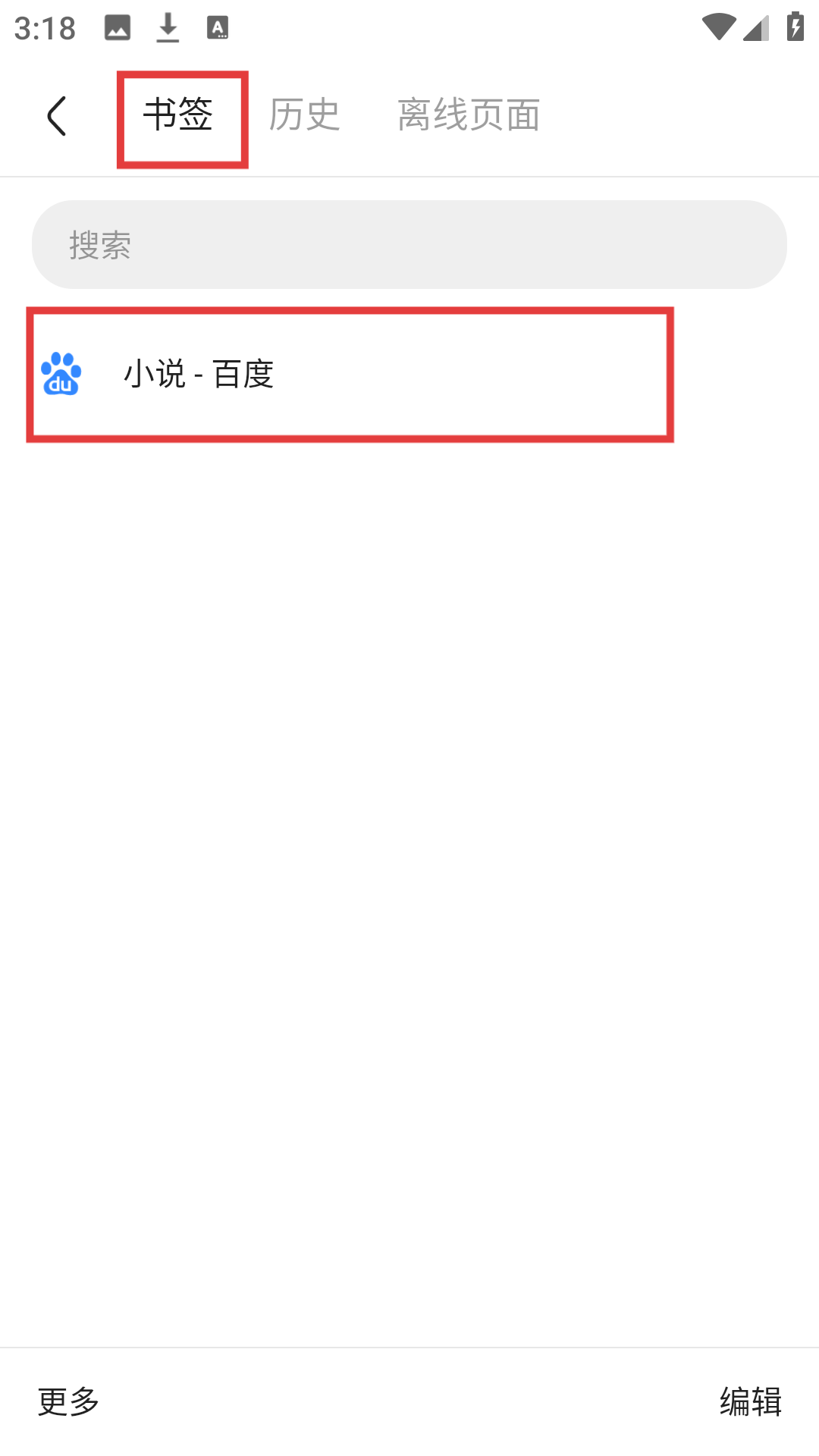 4、进入书签页面后,可看到已添加的“小说-百度”书签,后续随时点击即可快速访问该页面哦。