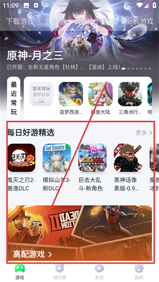 1、在游戏页面点击【高配游戏】入口,就能进入高配游戏合集页面,查看优质的3A游戏内容啦。