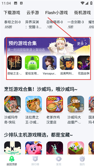 1、在软件的发现页,找到【预约游戏合集】板块,点击右侧的【更多】按钮,就能查看完整的预约游戏列表啦。
