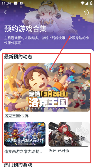 2、进入预约游戏合集页后,在【最新预约动态】里挑选感兴趣的游戏(如洛克王国:世界),点击即可进入详情页哦。